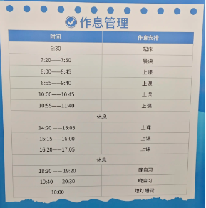 嚴格的時間管理:集訓營有嚴格的時間安排,包括起床、洗漱、吃飯、上課、午睡、晚自習和熄燈睡覺等時間,確保學生在良好的作息下專心學習。