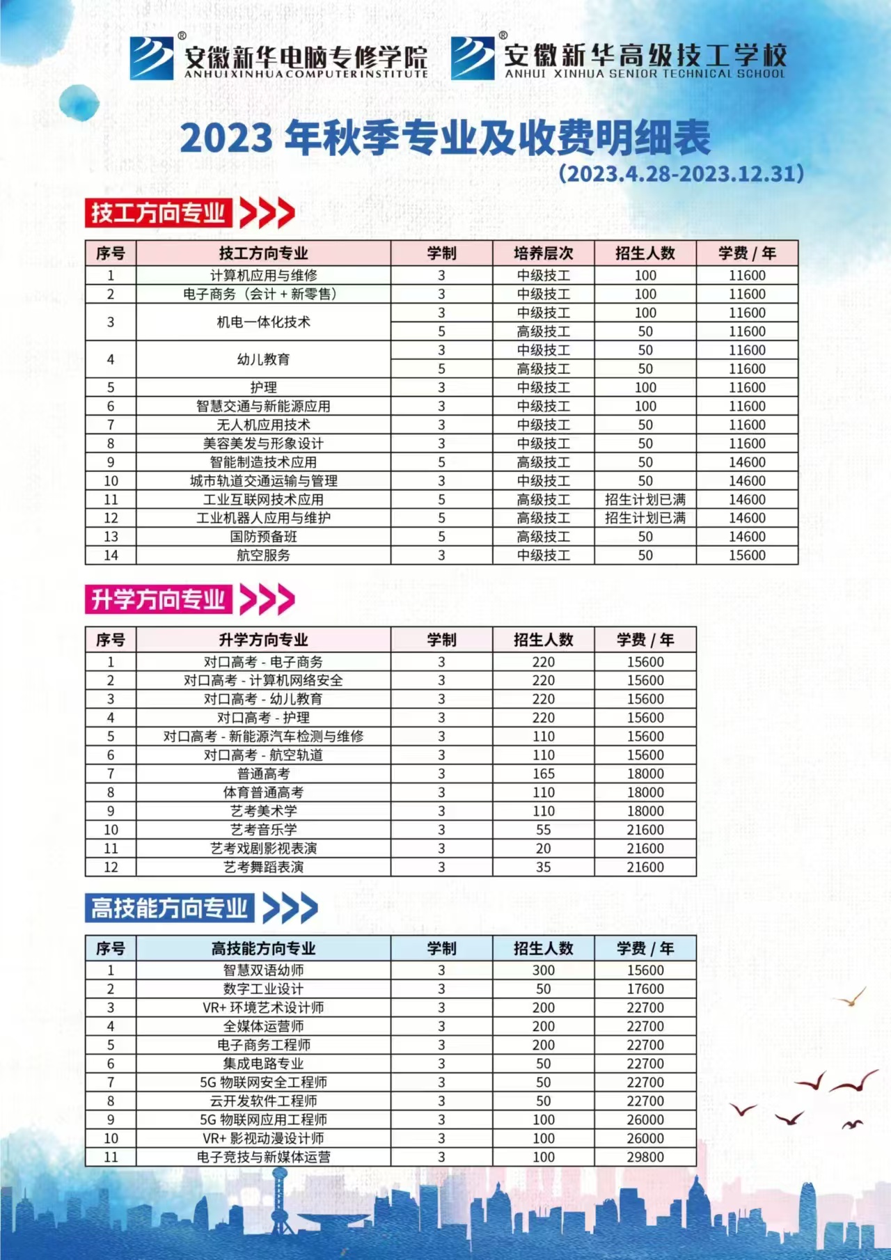 中、高級(jí)技工專業(yè):如計(jì)算機(jī)程序設(shè)計(jì)、城市軌道交通運(yùn)輸與管理、護(hù)理、智能制造技術(shù)應(yīng)用、航空服務(wù)、美術(shù)設(shè)計(jì)與制作等。