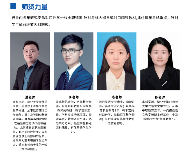 單招網擁有一支高水平的師資隊伍,教師團隊由具有高級職稱或相應教學資質的在編教師組成。他們不僅具備深厚的學科背景,還熟悉單招考試的命題規律和考試動態。在教學過程中,老師們能夠根據學生的實際情況制定個性化的教學計劃,提供精準的教學指導。同時,單招網還定期邀請行業專家進行講座和交流,不斷提升教師的教學水平和專業素養。