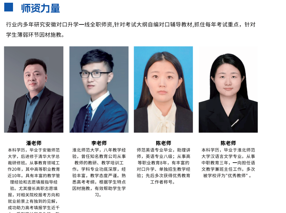 師資力量是衡量一個培訓機構教學質量的關鍵因素。頂尖的安徽單招培訓機構通常擁有一支由資深教師、行業專家和高校教授組成的師資團隊。他們不僅具備深厚的學科背景,還熟悉單招考試的命題規律和考試動態。以安徽單招網為例,該機構的教師團隊不僅具備高級職稱或相應教學資質,還具備豐富的教學經驗和專業知識,能夠為考生提供高質量的教學指導。