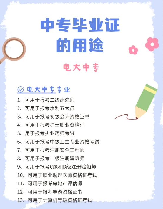 副業收入:對于已經擁有大學本科或更高學歷的同學,電大中專學歷可以實現快速滿足某些專業資格證書的前置學歷要求,如考二建證書等。