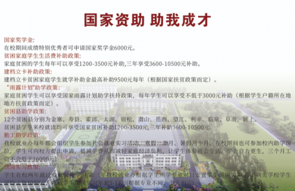 貧困縣專屬補助:金寨、壽縣等12個貧困縣學生,可享年1200-3500元補助。