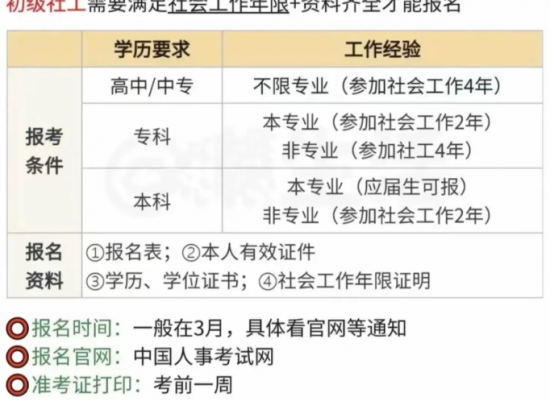 取得高中或者中專(zhuān)學(xué)歷,從事社會(huì)工作滿4年。